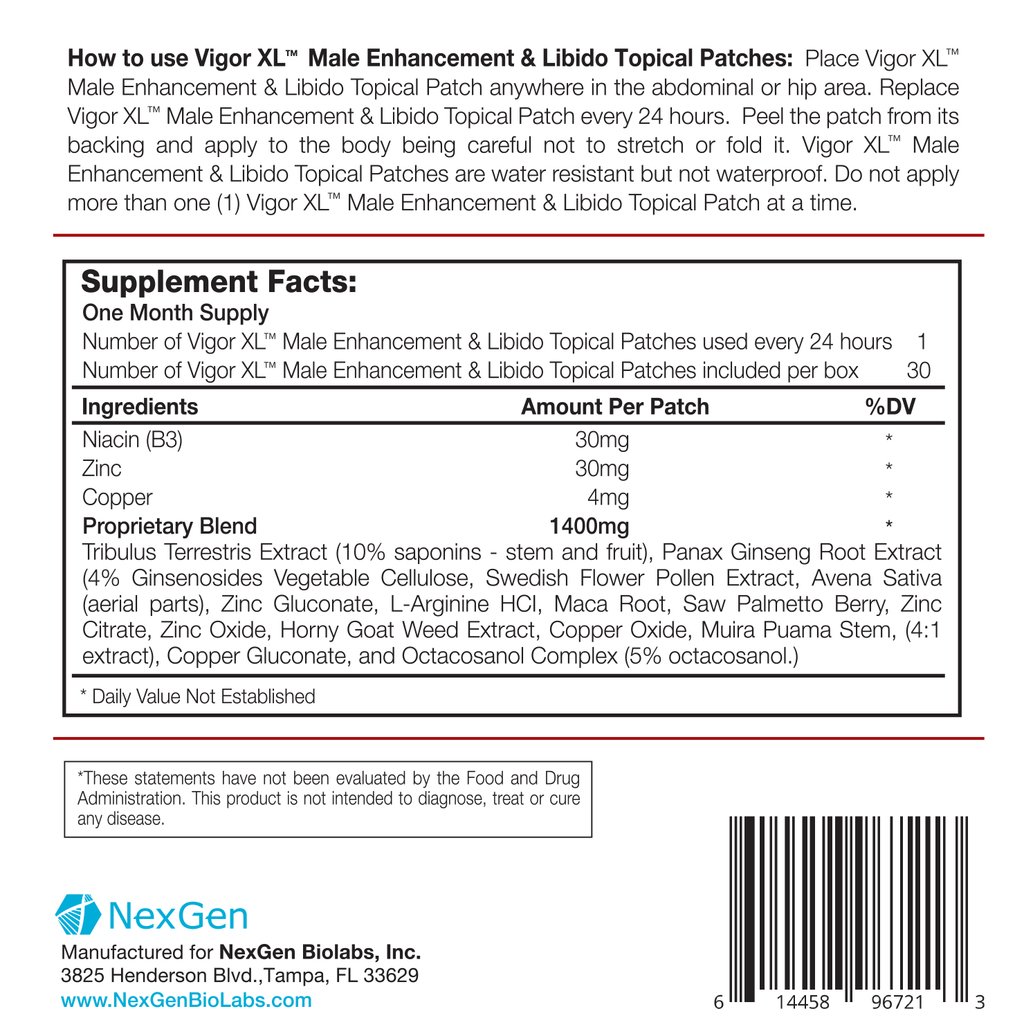 Vigor XL Male Enhancement & Libido Topical Patches (30-Count)Daily topical patches deliver a blend of herbal boosters to the body to help improve men’s libido and sexual performanceVigor XL Male Enhancement & Libido Topical Patches (30-Count)Potential BenefitsWorks to improve libido with a variety of potent herbal boostersMay increases sexual performance and pleasureHow to UsePeel the patch from its backingApply anywhere in the abdominal or hip area in a clean, hairless spotDo not apply more than one patch at a timeReplace patch every 24 hoursSpecifics30 topical patchesSupplement facts and ingredients