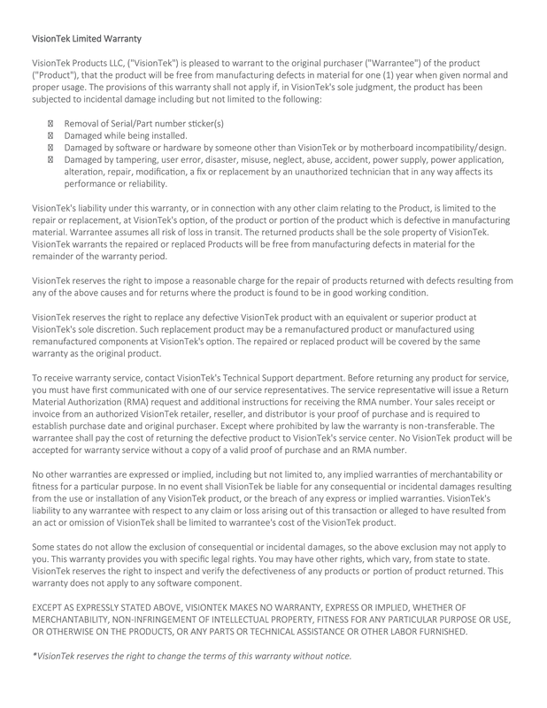 - Warranty: 2 years parts warranty provided by VisionTek.