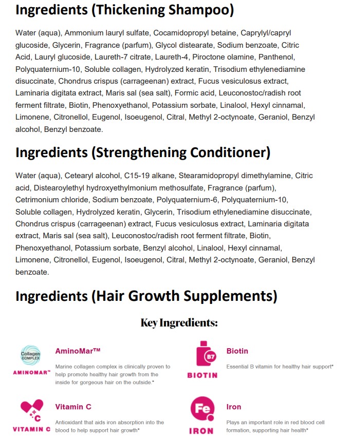 Viviscal Promotes Existing Hair Growth - Clinically Proven Dietary Supplement for Women 180 TabletsViviscal Extra Strength hair vitamin supplements for women nourish thinning hair and promote existing hair growth from within.Viviscal Extra Strength dietary supplements supply vital nutrients to the hair follicle to extend the Anagen (growing) phase of the hair growth cycle, nourish thinning hair, and enhance growth.Viviscal Thickening Shampoo 250 ml / 8.45 ozViviscal Thickening Shampoo gently cleanses the hair and scalp, leaving your hair looking fuller, thicker and healthier-looking. Our floral fresh signature fragrance, infused with lush greens, dewy florals, and hints of ocean breeze, leaves hair infused with a refreshing scent that lasts. Viviscal Thickening Shampoo promotes gorgeous hair and includes seaweed, marine collagen, biotin, and keratin.Viviscal Strengthening Conditioner 250 ml / 8.45 ozViviscal strengthening Conditioner, formulated with hair building blocks Biotin and Keratin, and fortified with Marine Collagen and Seaweed extract, delivers nourishing hydration without weighing hair down. This moisturizing formula conditions and strengthens leading to fuller, thicker, healthier looking hair with reduced breakage.
