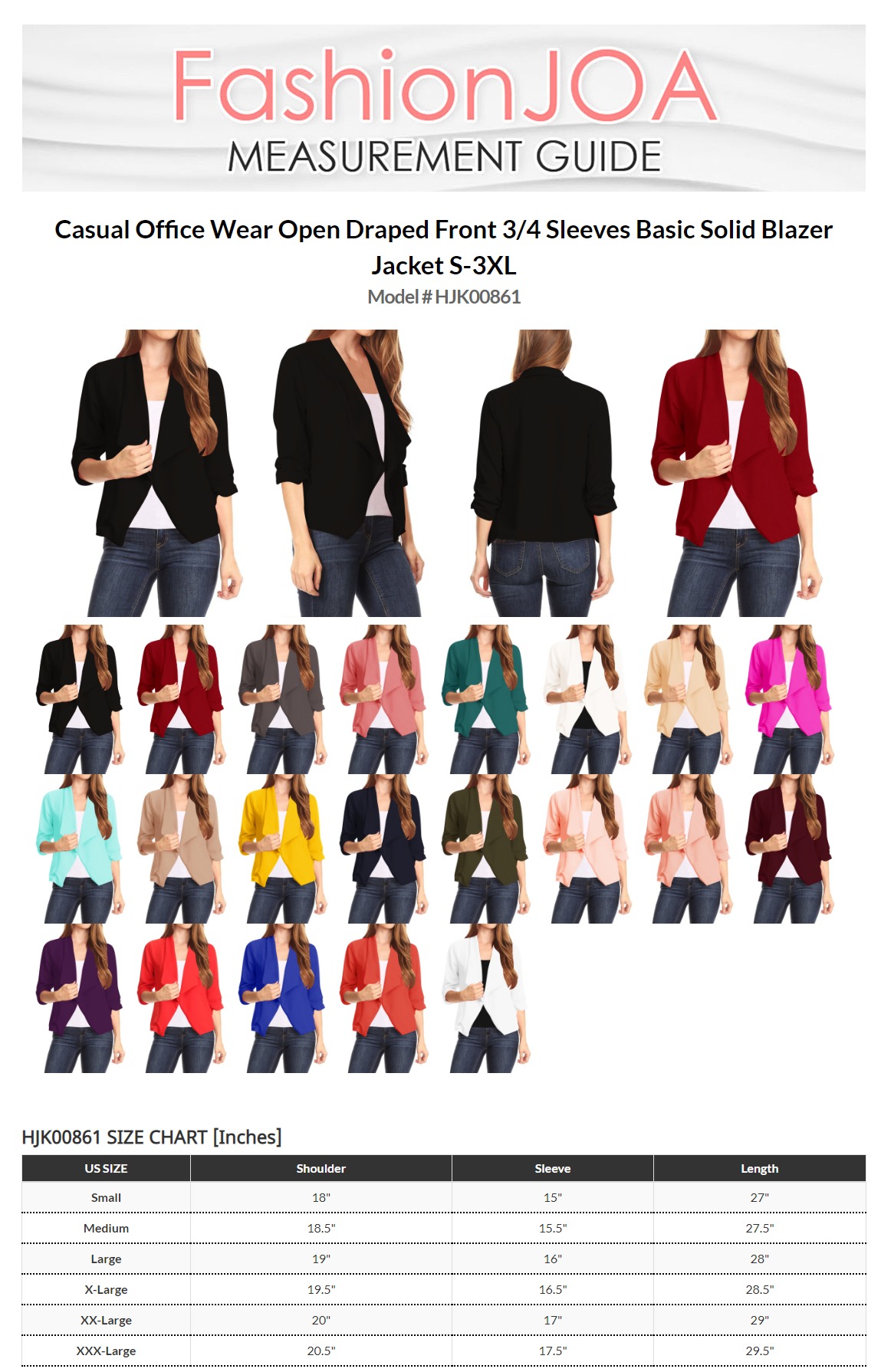 Casual, solid, waist length, blazer jacket in a fitted style with a draped open front, and ruched 3/4 length sleeves.