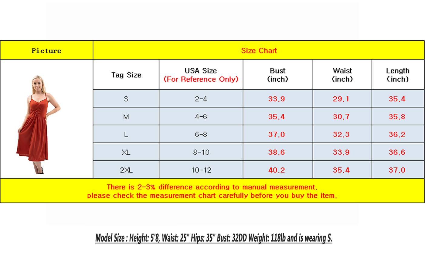 Specifications:Material: 80% Polyester+20% SpandexOptional Color: Black, Grey, OrangeOptional Size: S, M, L, XL, 2XLPattern: SolidLength: MidiWashing Requirements:* Hand wash or machine wash in cold water.* No chlorine bleach. Features:· Solid color sleeveless A-line midi dress with spaghetti straps, simple and classic design.· Perfect for any occasions, work, party, casual, vacation, beach and so on!· Made of light, thin, cool, and elastic cloth, perfect for summer!· High-waisted and upper sewed with elastic band, tummy-unseen and bust-highlighting pleated dress.· Soft and wearing comfortable, available in sizes small to XXL! Notes:* Please kindly compare the size chart before purchase.* Please kindly know that this dress is a no-pocket style.* Allow slight dimension difference due to different manual measurement.