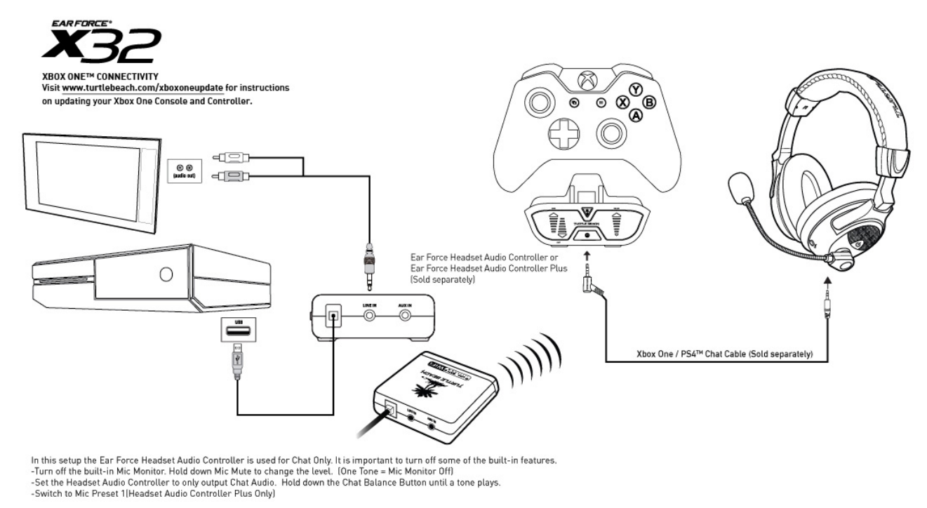 - Compatible with Xbox One with optional Turtle Beach Talkback Cable and, if there is no headset jack on the Xbox One controller, Headset Audio Controller Adapter (sold separately, see diagram)