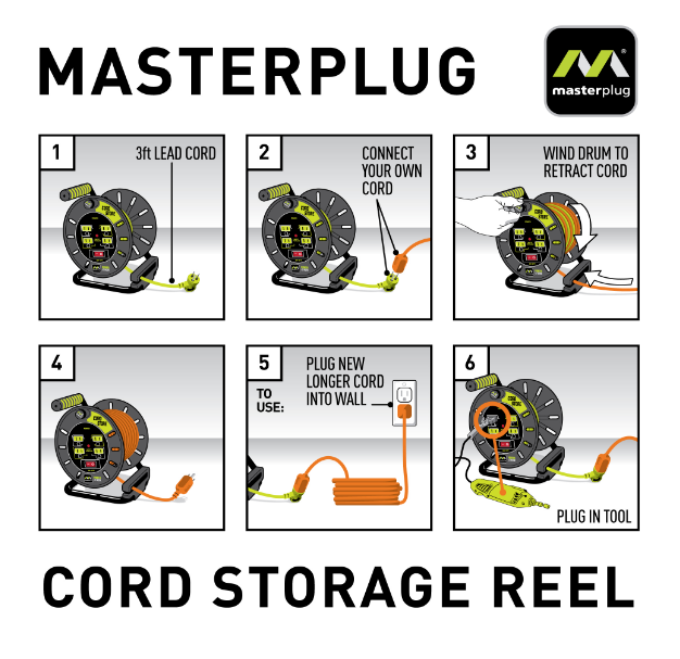 Masterplug extension cord reels come in 30ft, 40ft, 60ft, 80ft and 3ft lead. With four separate surge-protected outlets (10amp total) and an integrated cord that easily winds around a rugged spool to ensure you have power where you need it.
