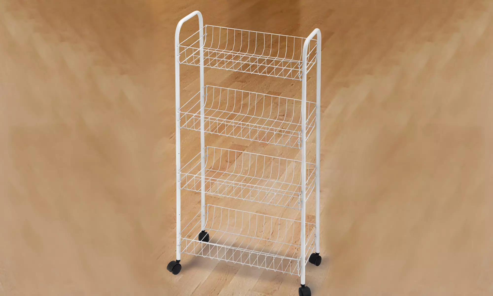White and black rolling carts are sturdy enough to carry heavy loads, but slim enough to tuck easily away when they aren’t in use