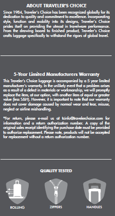 - Spinner luggage 22”H x 13.5”W x 8.5”D + 2” Expansion (Weight: 5.6 lb.)