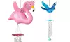 Metal chimes hang from a hand-painted blue-jay model with wings that move up and down in the breeze for a whimsical, eye-catching look