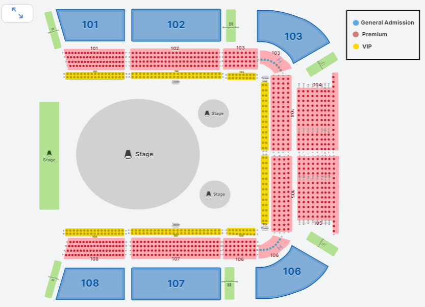 - General Admission seating is the outer ring (BLUE AREAS): Sections 101 to 103 and 106 to 108 are shown on the seating chart.