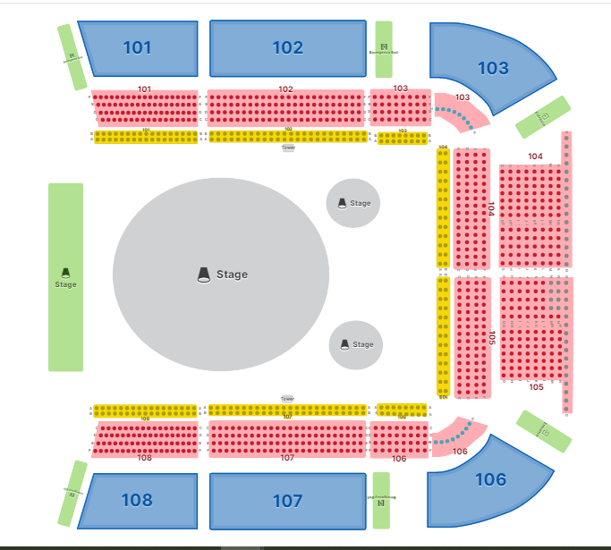 • General Admission seating is the outer ring (BLUE AREAS): Sections 101 to 103 and 106 to 108 shown on seating chart.