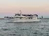 The luxury vessel features a climate-controlled interior with lounge-style seating, wrap-around outdoor decks, a spacious upper deck with panoramic views, a professional-grade sound system, and a yacht-like interior.