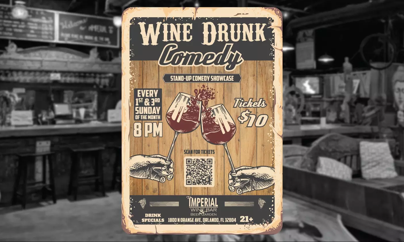 Get ready for an unforgettable evening of laughter at Wine Drunk Comedy! Featuring an all-star lineup of Florida's finest comedians and surprise drop-ins from talented performers nationwide. Sip on specially crafted drink specials while being entertained by top-notch comedy performances!