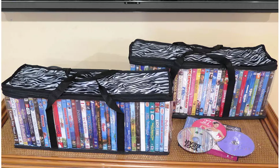 This set of 2 stylish black and white zebra print portable DVD holders are ideal storage bags to keep your favorite movies free of scratches and dust. Holds a total of 33 DVDs in each bag, all together holds 66 DVDs! Features strong polyester fabric carrying handles for ease in transporting from room to room or to take along on vacation. These storage bags make finding all of your DVDs quick and easy because they are all located in one spot instead of spread through out the house. Lightweight polyester and PVC construction with zipper closure for easy access. Measures approximately 20"L x 6"W x 8"H overall.