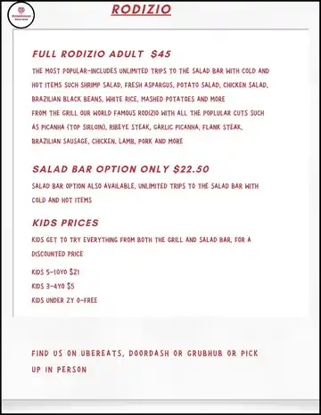 - This deal is valid on full Rodizio only, not valid on a la carte, to go, salad bar only, or kids discount