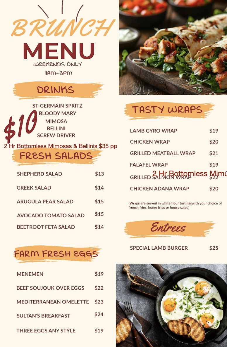 Sultan Mediterranean Cuisine stands out as it captures the essence of true Mediterranean dining right in the heart of New York City. The opportunity to enjoy bottomless mimosas and bellinis enhances the overall brunch experience, making it not just about food but also fun moments shared over delightful drinks. Their wide array of dishes caters to various preferences, whether one enjoys savory meats or prefers vegetarian options - there's truly something here for everyone! Add this to their expert culinary craftsmanship showcased through every meal served; diners can expect nothing short of great quality flavorings on their plates each visit.