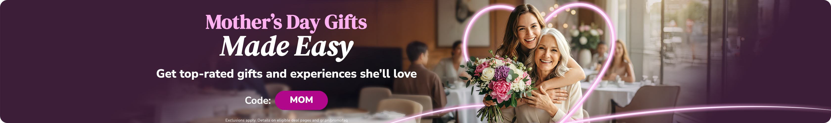 Looking for something more personal? Browse customized gifts and unique experiences designed to show your appreciation. With Mother’s Day deals available near you, Groupon helps you find the perfect way to celebrate Mom while supporting local businesses.