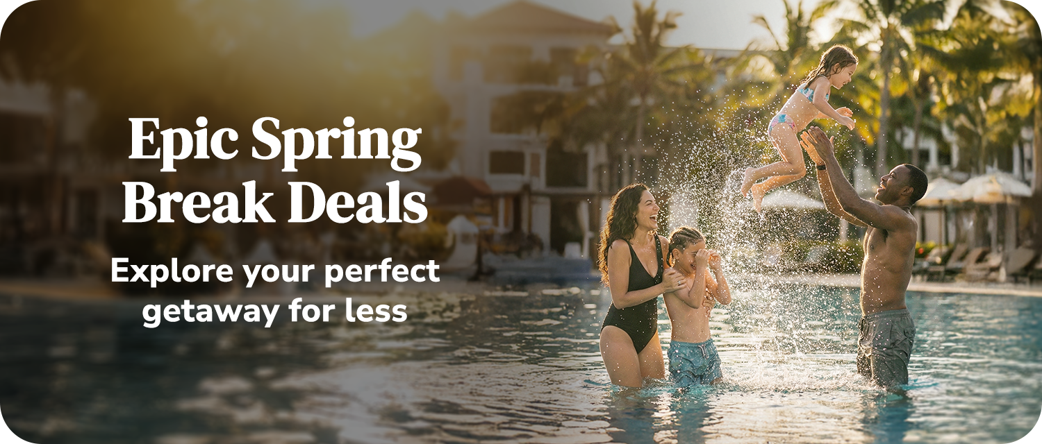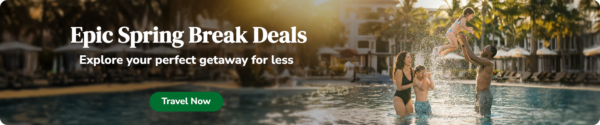 From beach resorts in Cancun and Miami to cabin getaways and Las Vegas escapes, our Spring Break travel deals are designed to fit your budget and your vibe. Save big on hotels, vacation packages, and last-minute getaways—with extras like flexible booking and exclusive perks.
